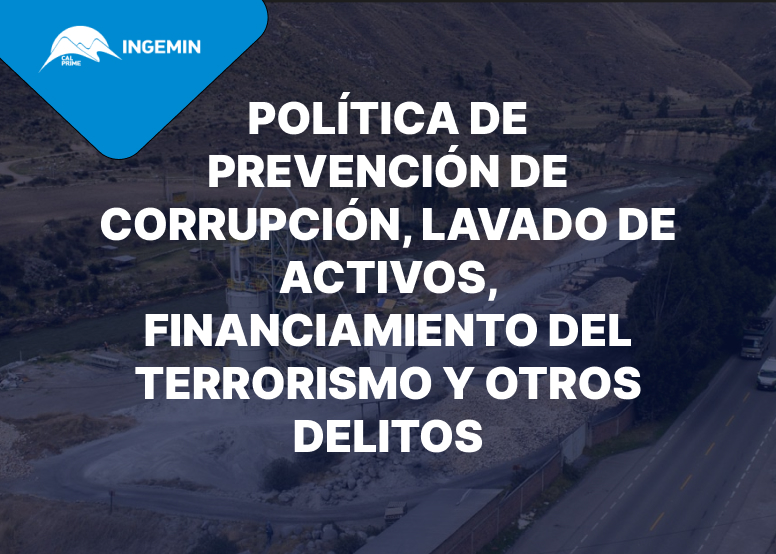 INGEMIN S.A.C. está comprometida con la implementación de buenas prácticas para salvaguardar la integridad y la transparencia tanto de la empresa como de sus partes interesadas. Nuestra conducta empresarial se basa en los principios fundamentales de nuestra entidad y se enfoca en la ética, el cumplimiento y la prevención de delitos. En ese sentido, contamos con un Programa de Cumplimiento que establece Políticas y Procedimientos para prevenir y evitar la comisión de delitos de lavado de activos, financiamiento del terrorismo, corrupción, prácticas anticompetitivas y otros delitos dentro de nuestras operaciones.